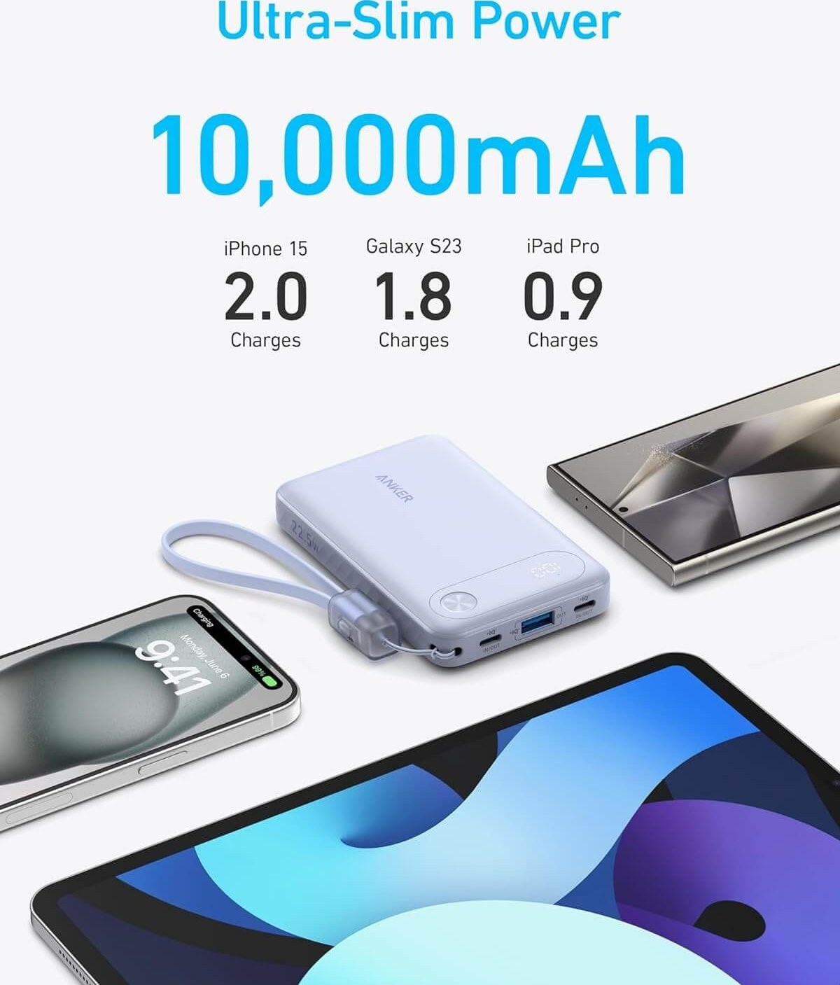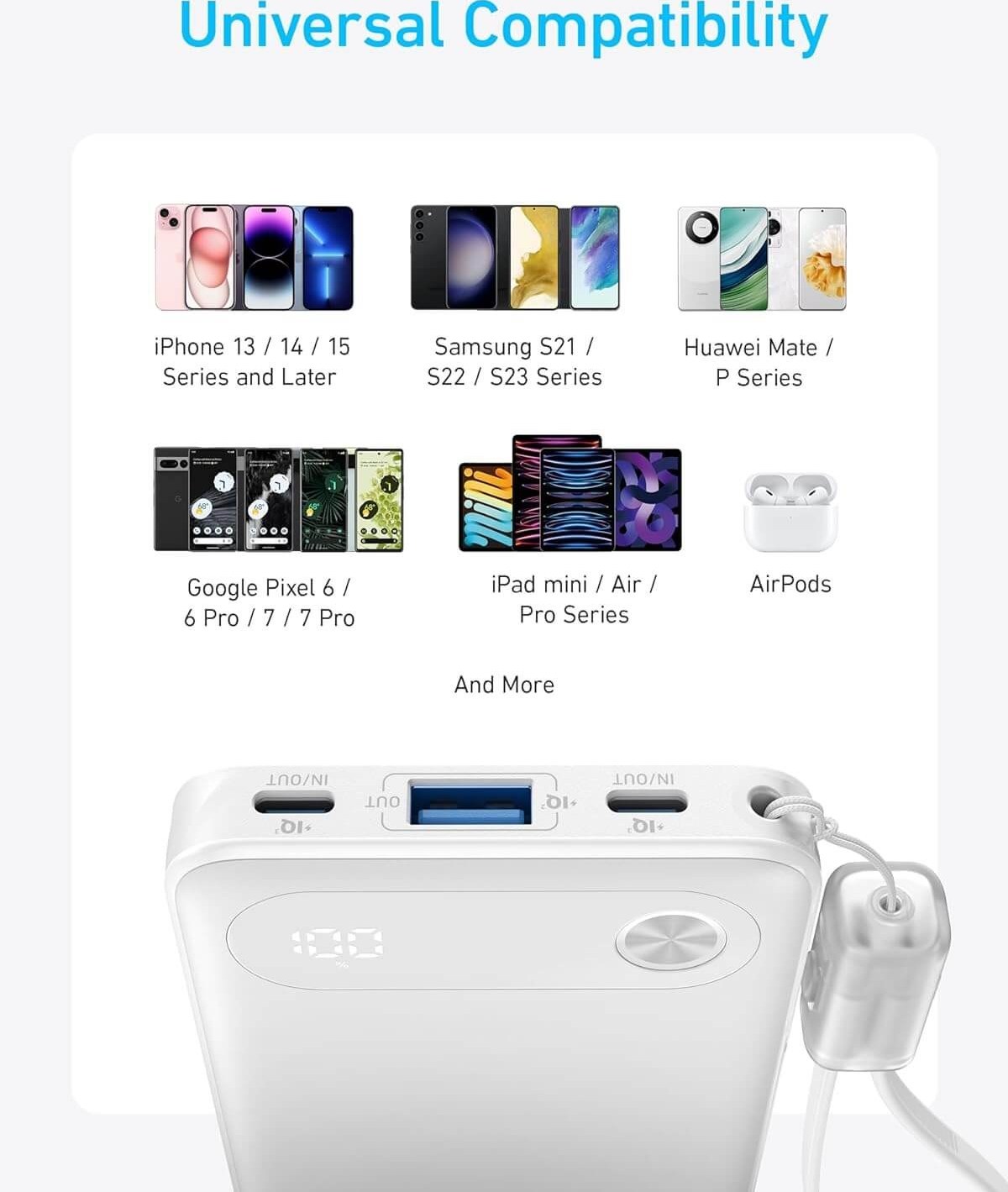 پشتیبانی از شارژ سریع 22.5 وات PD / دارای دو درگاه USB-C و یک درگاه USB-A / کابل داخلی با طراحی لنیارد برای دسترسی آسان و جلوگیری از فراموشی کابل /